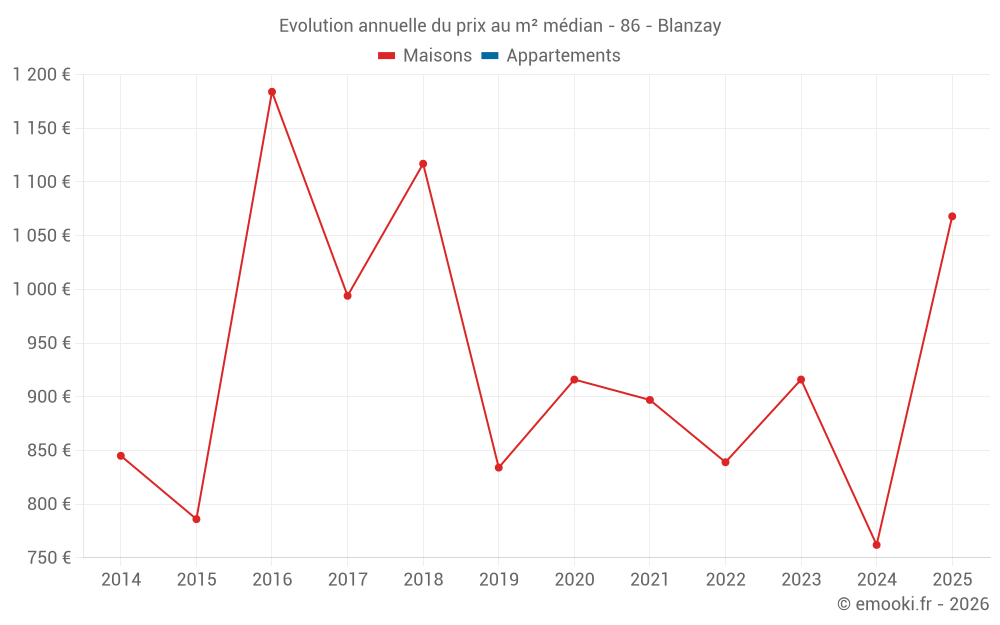 Le prix médian sur les 17 transactions de maisons des 12 derniers mois dans la commune de Blanzay était de 775 € par mètre carré pour une valeur foncière médiane de 128 000 €. Sur cette période 60% des transactions se sont situées entre 659 et 1 296 € par mètre carré (du 2ème au 8ème déciles).