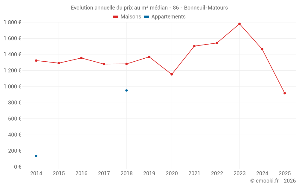 Le prix médian sur les 23 transactions de maisons des 12 derniers mois dans la commune de Bonneuil-Matours était de 1 438 € par mètre carré pour une valeur foncière médiane de 135 000 €. Sur cette période 60% des transactions se sont situées entre 915 et 1 810 € par mètre carré (du 2ème au 8ème déciles).