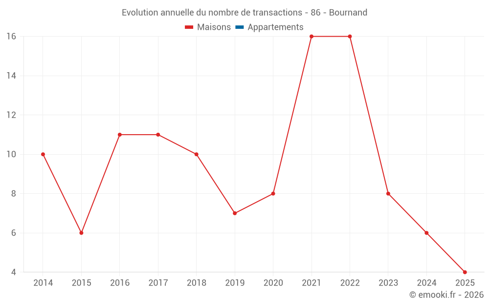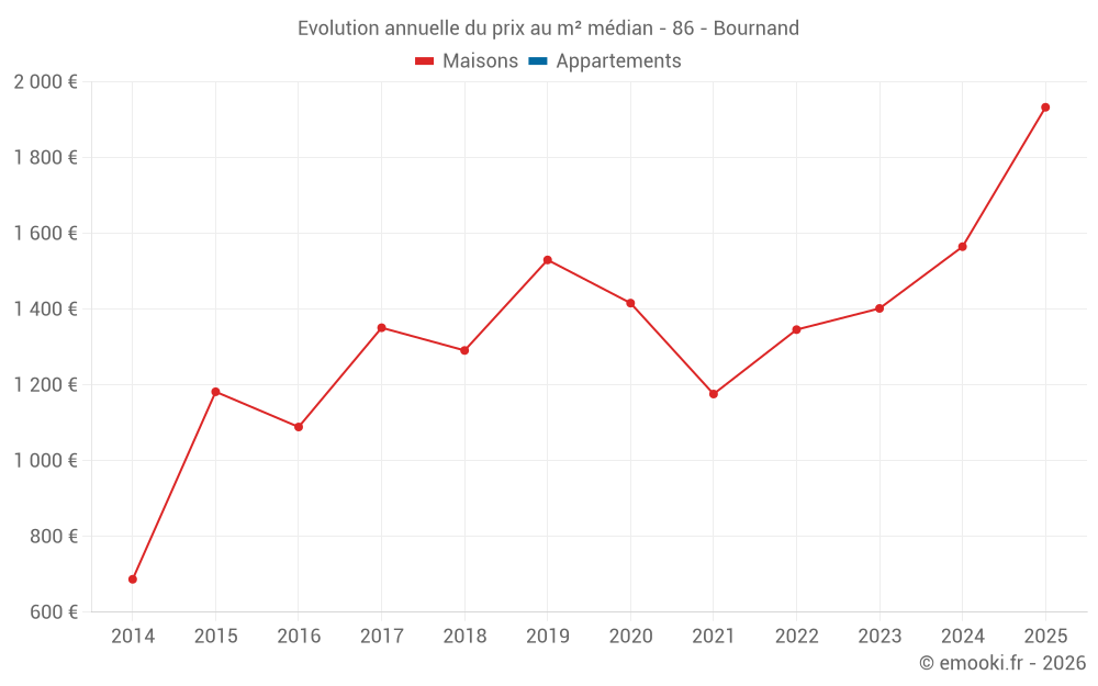 Le prix médian sur les 14 transactions de maisons des 24 derniers mois dans la commune de Bournand était de 1 565 € par mètre carré pour une valeur foncière médiane de 152 450 €. Sur cette période 60% des transactions se sont situées entre 1 191 et 2 032 € par mètre carré (du 2ème au 8ème déciles).