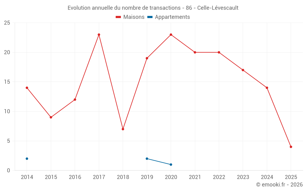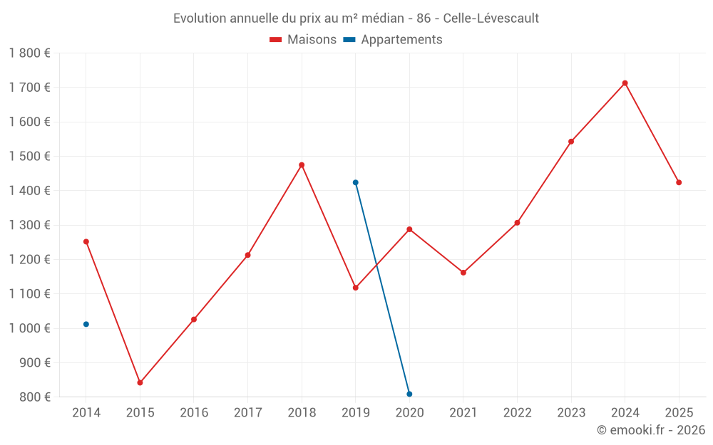 Le prix médian sur les 26 transactions de maisons des 24 derniers mois dans la commune de Celle-Lévescault était de 1 581 € par mètre carré pour une valeur foncière médiane de 162 450 €. Sur cette période 60% des transactions se sont situées entre 1 333 et 1 754 € par mètre carré (du 2ème au 8ème déciles).