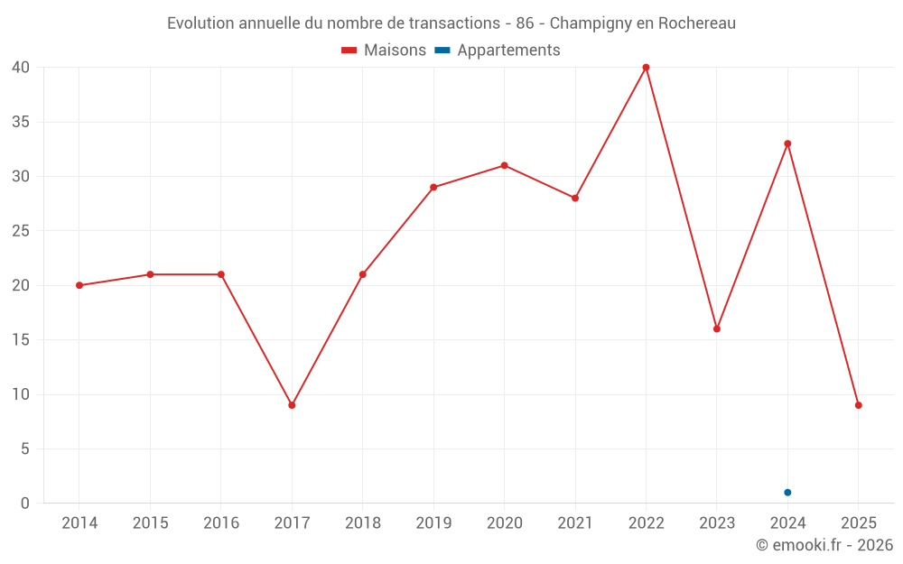Le prix médian sur les 29 transactions de maisons des 12 derniers mois dans la commune de Champigny en Rochereau était de 1 443 € par mètre carré pour une valeur foncière médiane de 145 000 €. Sur cette période 60% des transactions se sont situées entre 1 141 et 2 047 € par mètre carré (du 2ème au 8ème déciles).