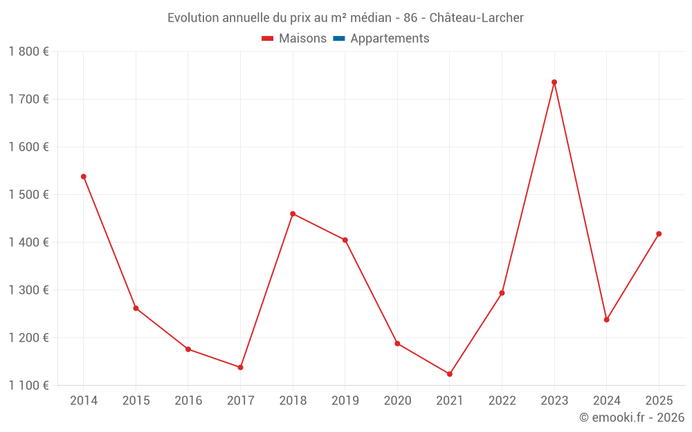 Le prix médian sur les 20 transactions de maisons des 24 derniers mois dans la commune de Château-Larcher était de 1 505 € par mètre carré pour une valeur foncière médiane de 147 500 €. Sur cette période 60% des transactions se sont situées entre 1 217 et 1 804 € par mètre carré (du 2ème au 8ème déciles).
