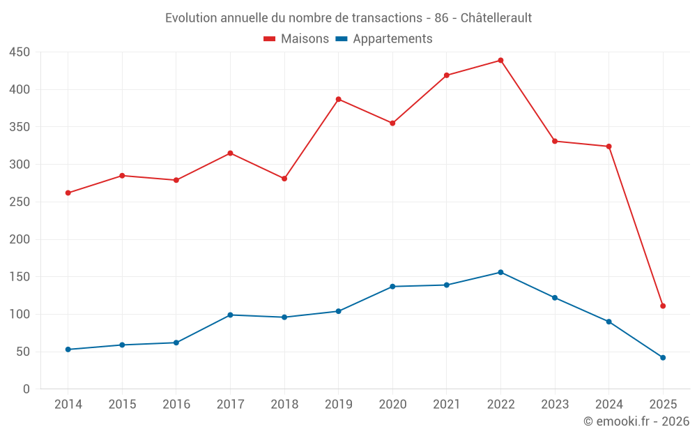 Le prix médian sur les 37 transactions de maisons des 3 derniers mois dans la commune de Châtellerault était de 1 413 € par mètre carré pour une valeur foncière médiane de 126 000 €. Sur cette période 60% des transactions se sont situées entre 1 045 et 1 779 € par mètre carré (du 2ème au 8ème déciles).