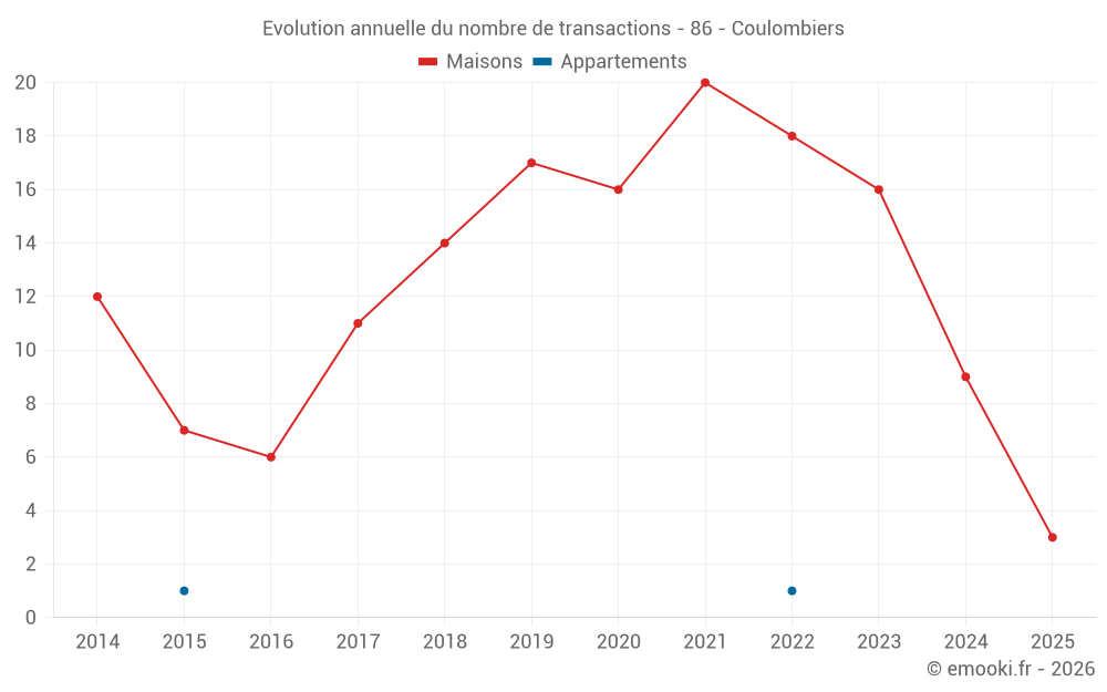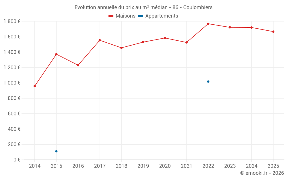 Le prix médian sur les 20 transactions de maisons des 24 derniers mois dans la commune de Coulombiers était de 1 754 € par mètre carré pour une valeur foncière médiane de 158 250 €. Sur cette période 60% des transactions se sont situées entre 1 555 et 1 970 € par mètre carré (du 2ème au 8ème déciles).