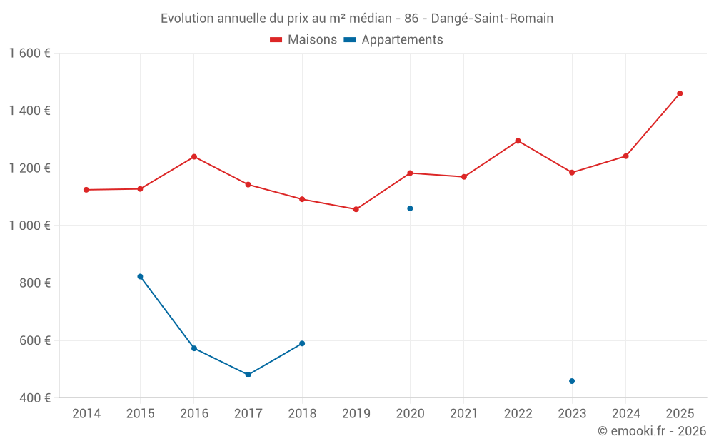 Le prix médian sur les 30 transactions de maisons des 12 derniers mois dans la commune de Dangé-Saint-Romain était de 1 254 € par mètre carré pour une valeur foncière médiane de 114 500 €. Sur cette période 60% des transactions se sont situées entre 982 et 1 698 € par mètre carré (du 2ème au 8ème déciles).