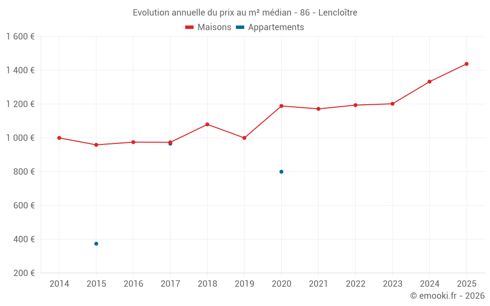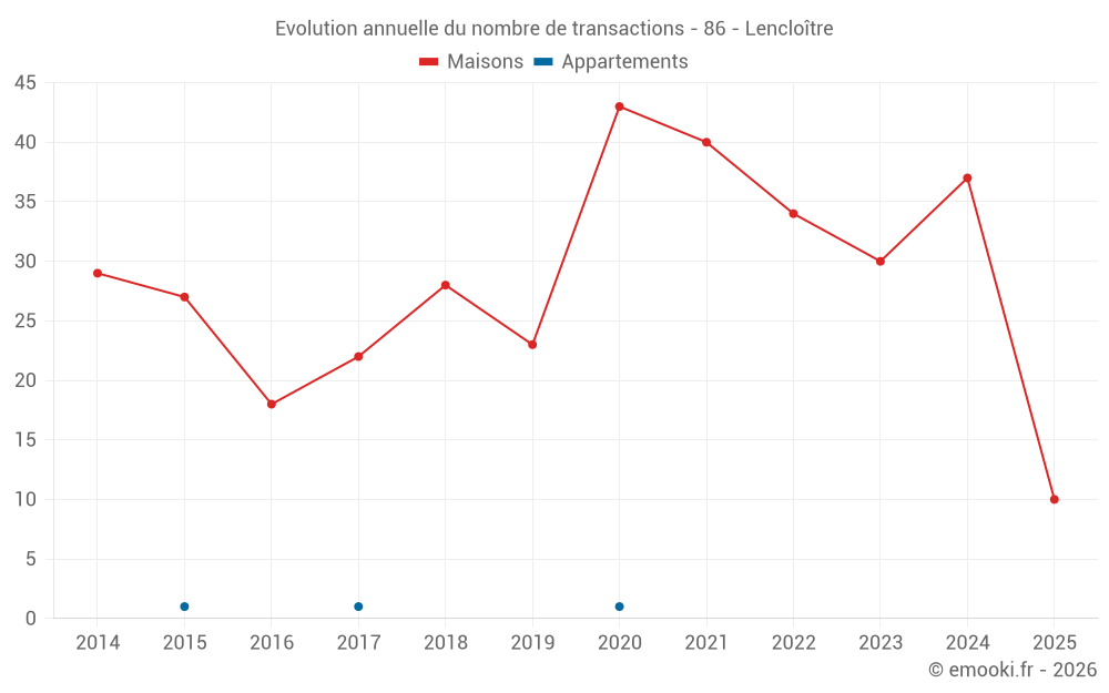 Le prix médian sur les 29 transactions de maisons des 12 derniers mois dans la commune de Lencloître était de 1 397 € par mètre carré pour une valeur foncière médiane de 125 000 €. Sur cette période 60% des transactions se sont situées entre 953 et 1 690 € par mètre carré (du 2ème au 8ème déciles).