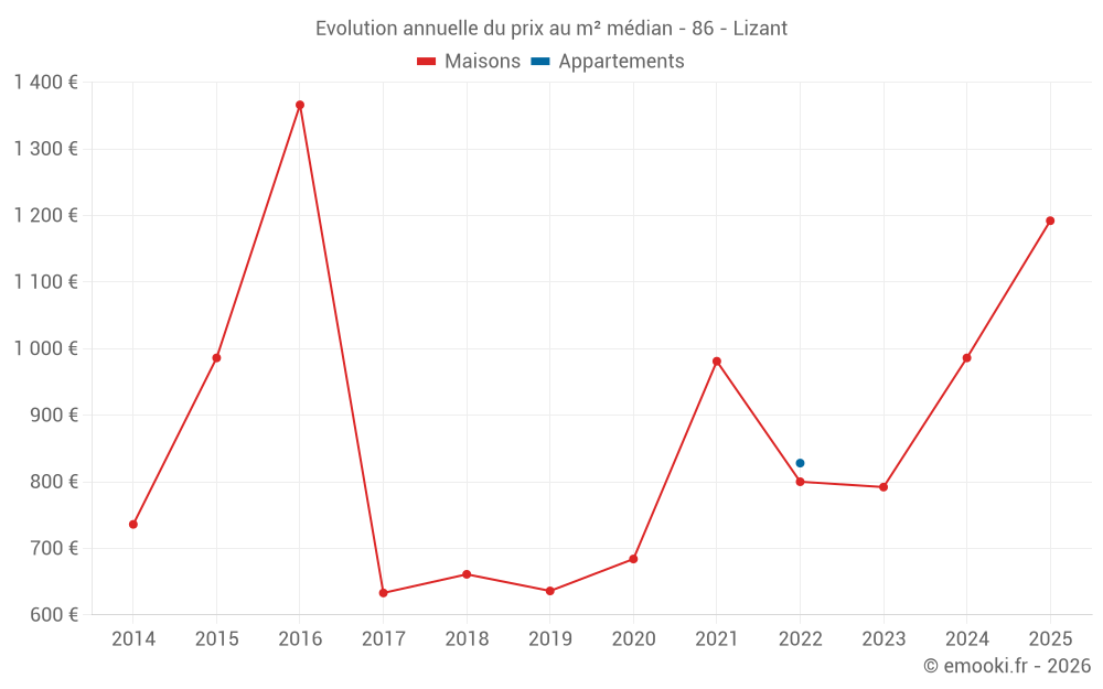 Le prix médian sur les 15 transactions de maisons des 24 derniers mois dans la commune de Lizant était de 986 € par mètre carré pour une valeur foncière médiane de 137 000 €. Sur cette période 60% des transactions se sont situées entre 473 et 1 678 € par mètre carré (du 2ème au 8ème déciles).