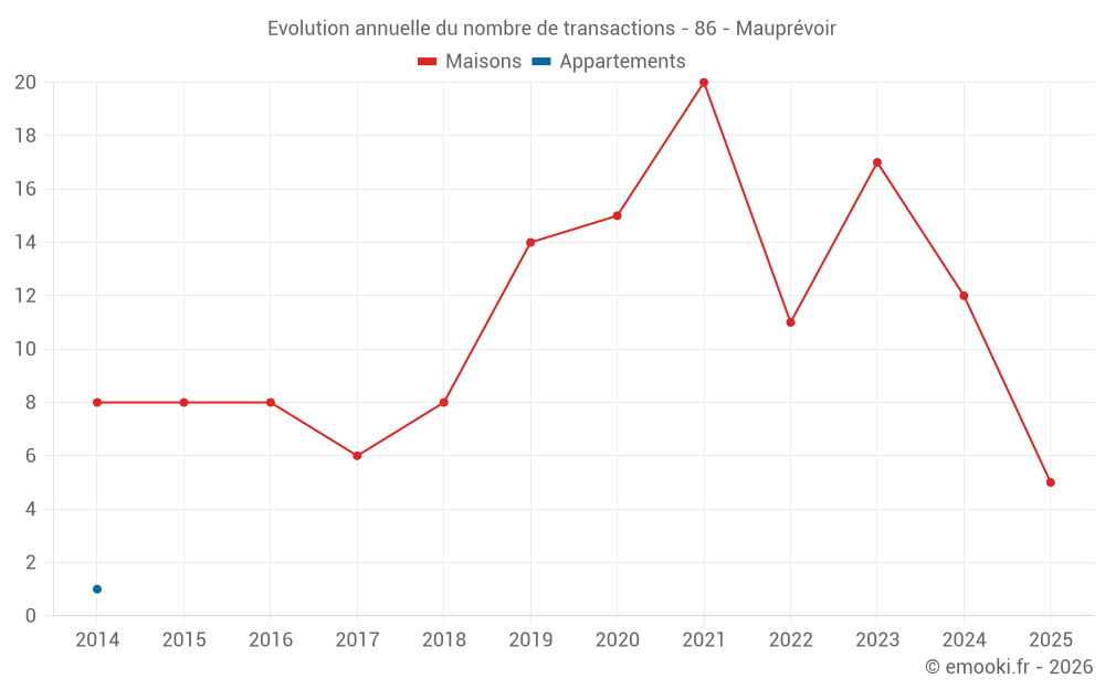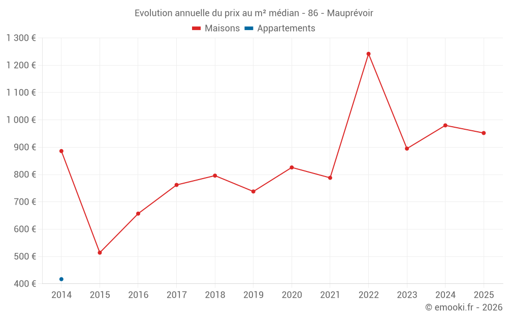 Le prix médian sur les 26 transactions de maisons des 24 derniers mois dans la commune de Mauprévoir était de 916 € par mètre carré pour une valeur foncière médiane de 78 000 €. Sur cette période 60% des transactions se sont situées entre 429 et 1 310 € par mètre carré (du 2ème au 8ème déciles).