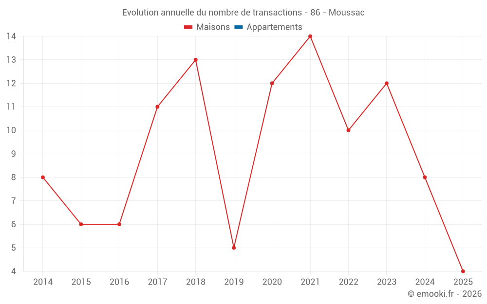 Le prix médian sur les 20 transactions de maisons des 24 derniers mois dans la commune de Moussac était de 856 € par mètre carré pour une valeur foncière médiane de 70 000 €. Sur cette période 60% des transactions se sont situées entre 398 et 1 796 € par mètre carré (du 2ème au 8ème déciles).