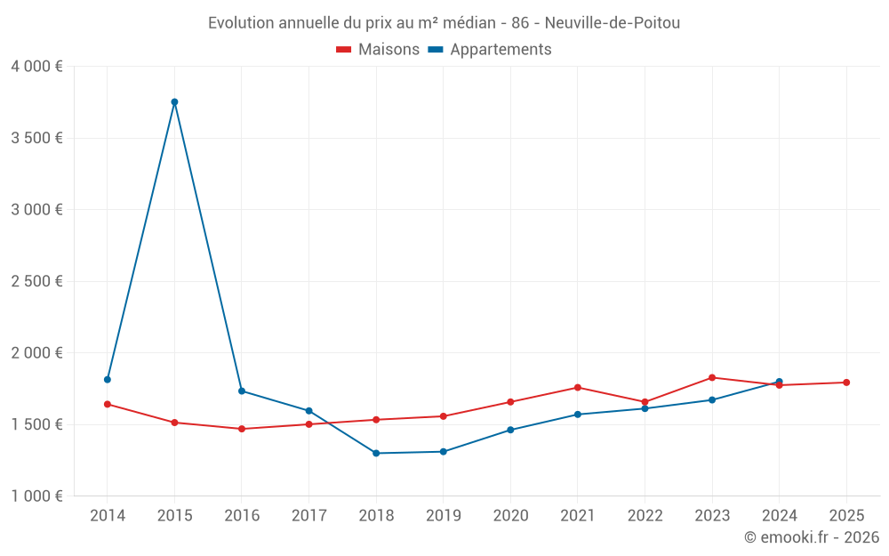 Le prix médian sur les 24 transactions de maisons des 6 derniers mois dans la commune de Neuville-de-Poitou était de 1 794 € par mètre carré pour une valeur foncière médiane de 192 142 €. Sur cette période 60% des transactions se sont situées entre 1 313 et 2 221 € par mètre carré (du 2ème au 8ème déciles).