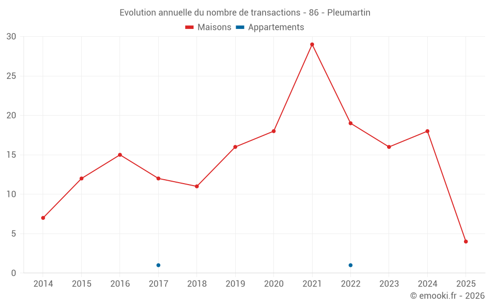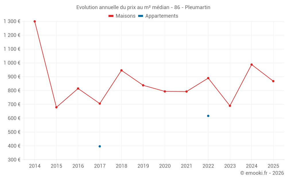 Le prix médian sur les 16 transactions de maisons des 12 derniers mois dans la commune de Pleumartin était de 908 € par mètre carré pour une valeur foncière médiane de 93 500 €. Sur cette période 60% des transactions se sont situées entre 813 et 1 194 € par mètre carré (du 2ème au 8ème déciles).
