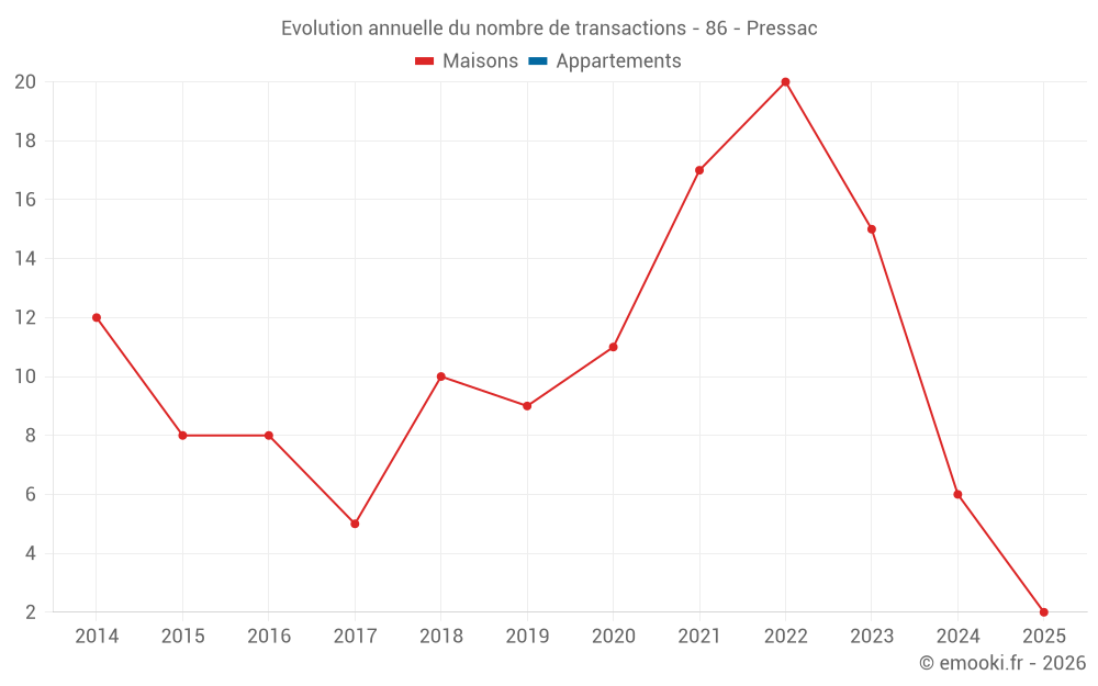 Le prix médian sur les 16 transactions de maisons des 24 derniers mois dans la commune de Pressac était de 874 € par mètre carré pour une valeur foncière médiane de 80 750 €. Sur cette période 60% des transactions se sont situées entre 584 et 1 649 € par mètre carré (du 2ème au 8ème déciles).