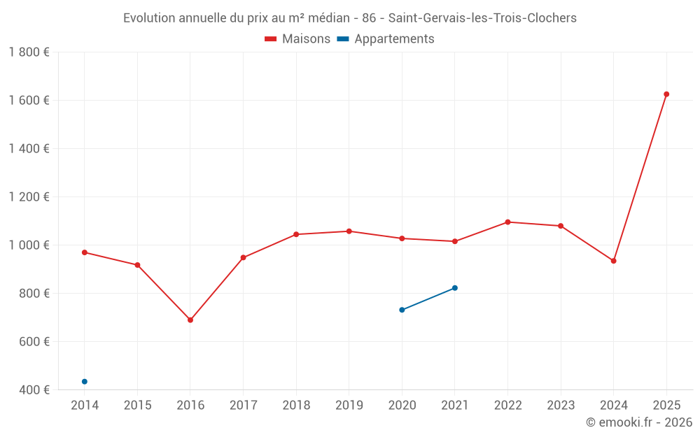 Le prix médian sur les 19 transactions de maisons des 24 derniers mois dans la commune de Saint-Gervais-les-Trois-Clochers était de 1 111 € par mètre carré pour une valeur foncière médiane de 112 000 €. Sur cette période 60% des transactions se sont situées entre 764 et 1 590 € par mètre carré (du 2ème au 8ème déciles).
