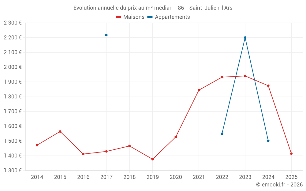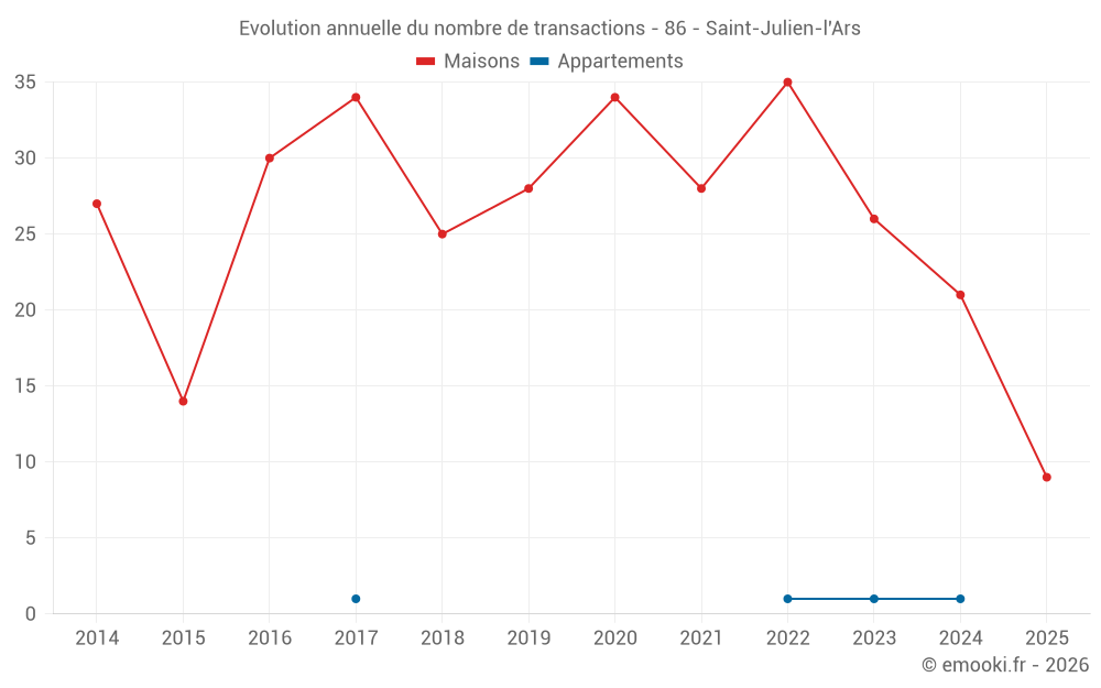 Le prix médian sur les 23 transactions de maisons des 12 derniers mois dans la commune de Saint-Julien-l'Ars était de 1 845 € par mètre carré pour une valeur foncière médiane de 215 000 €. Sur cette période 60% des transactions se sont situées entre 1 391 et 2 278 € par mètre carré (du 2ème au 8ème déciles).