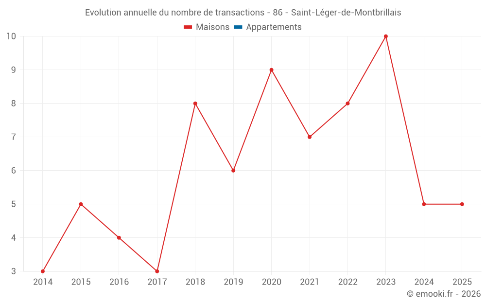 Le prix médian sur les 16 transactions de maisons des 24 derniers mois dans la commune de Saint-Léger-de-Montbrillais était de 1 016 € par mètre carré pour une valeur foncière médiane de 85 700 €. Sur cette période 60% des transactions se sont situées entre 208 et 1 260 € par mètre carré (du 2ème au 8ème déciles).