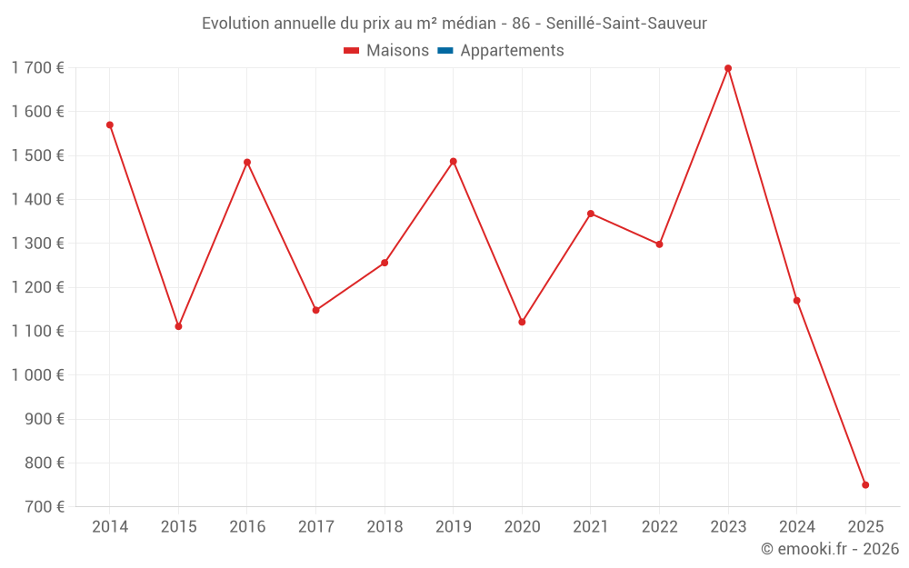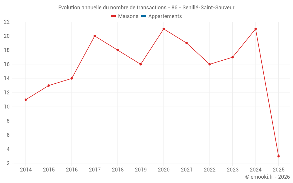 Le prix médian sur les 17 transactions de maisons des 12 derniers mois dans la commune de Senillé-Saint-Sauveur était de 1 293 € par mètre carré pour une valeur foncière médiane de 125 000 €. Sur cette période 60% des transactions se sont situées entre 970 et 1 809 € par mètre carré (du 2ème au 8ème déciles).