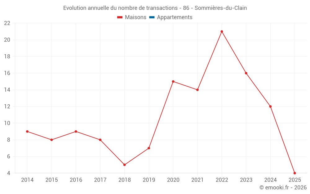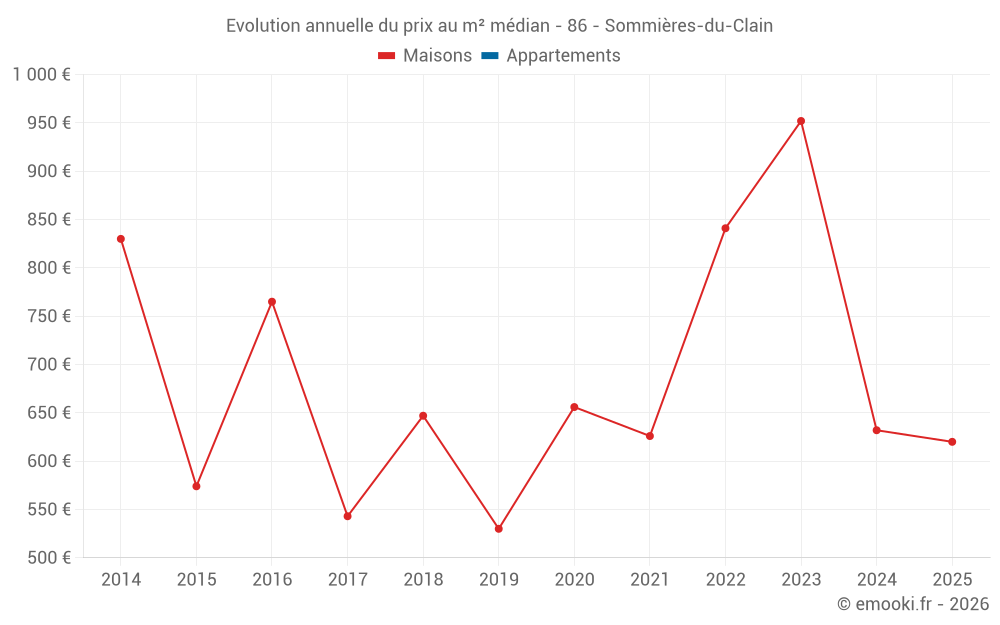 Le prix médian sur les 25 transactions de maisons des 24 derniers mois dans la commune de Sommières-du-Clain était de 681 € par mètre carré pour une valeur foncière médiane de 61 000 €. Sur cette période 60% des transactions se sont situées entre 444 et 1 021 € par mètre carré (du 2ème au 8ème déciles).
