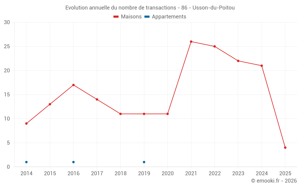 Le prix médian sur les 38 transactions de maisons des 24 derniers mois dans la commune d'Usson-du-Poitou était de 833 € par mètre carré pour une valeur foncière médiane de 68 000 €. Sur cette période 60% des transactions se sont situées entre 470 et 1 068 € par mètre carré (du 2ème au 8ème déciles).