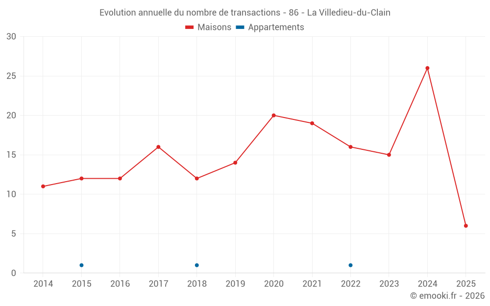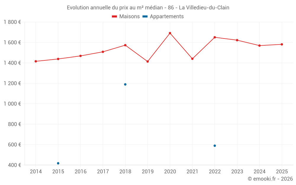 Le prix médian sur les 20 transactions de maisons des 12 derniers mois dans la commune de la Villedieu-du-Clain était de 1 624 € par mètre carré pour une valeur foncière médiane de 159 500 €. Sur cette période 60% des transactions se sont situées entre 1 277 et 1 872 € par mètre carré (du 2ème au 8ème déciles).