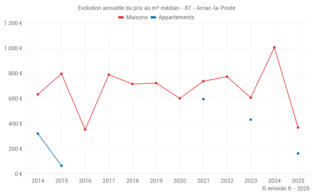 Le prix médian sur les 20 transactions de maisons des 12 derniers mois dans la commune d'Arnac-la-Poste était de 798 € par mètre carré pour une valeur foncière médiane de 70 050 €. Sur cette période 60% des transactions se sont situées entre 310 et 1 057 € par mètre carré (du 2ème au 8ème déciles).