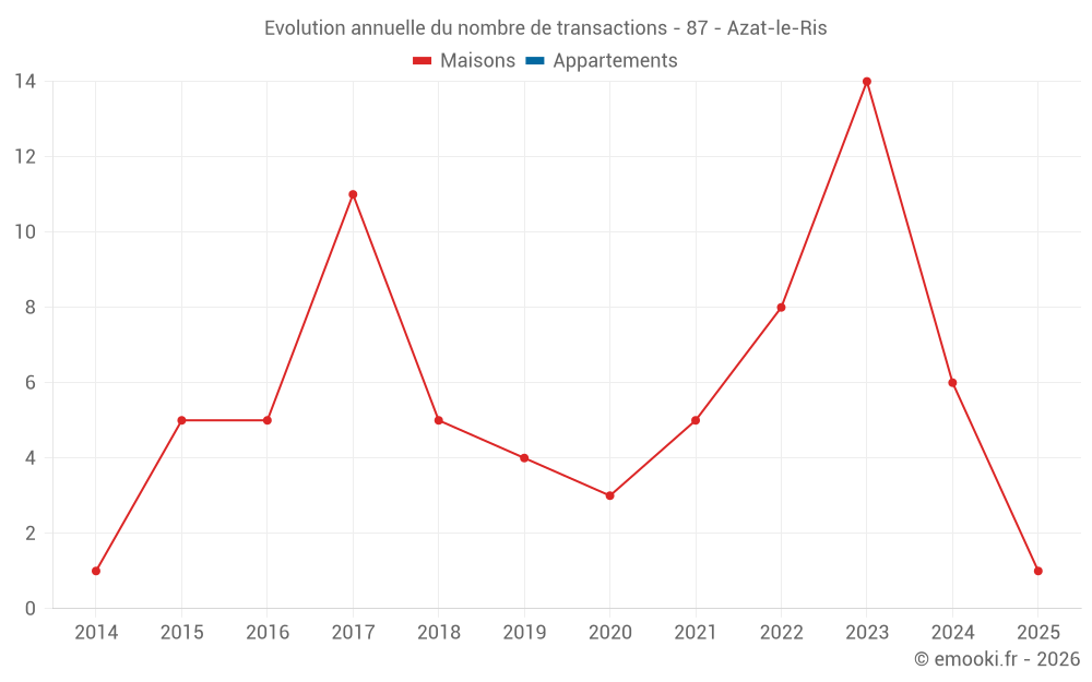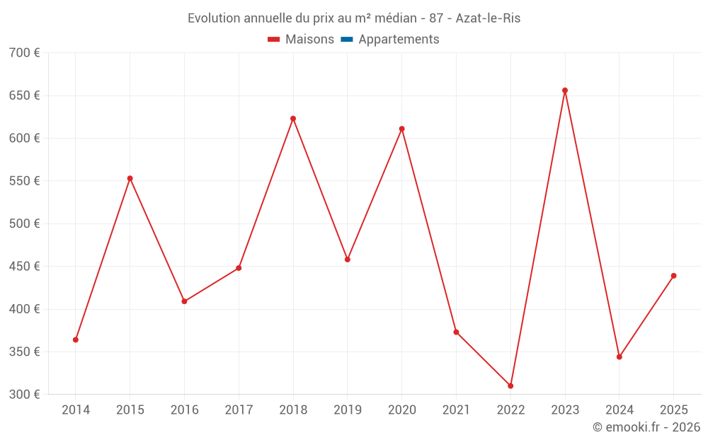 Le prix médian sur les 14 transactions de maisons des 24 derniers mois dans la commune d'Azat-le-Ris était de 560 € par mètre carré pour une valeur foncière médiane de 52 500 €. Sur cette période 60% des transactions se sont situées entre 220 et 756 € par mètre carré (du 2ème au 8ème déciles).