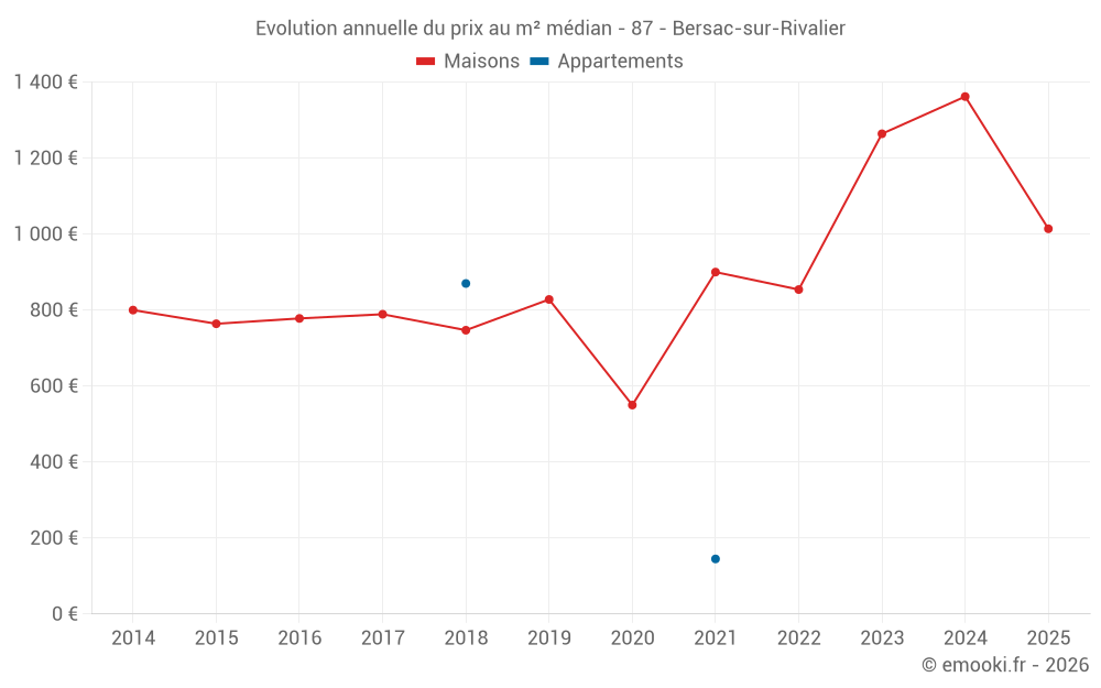 Le prix médian sur les 17 transactions de maisons des 24 derniers mois dans la commune de Bersac-sur-Rivalier était de 1 124 € par mètre carré pour une valeur foncière médiane de 94 620 €. Sur cette période 60% des transactions se sont situées entre 743 et 1 808 € par mètre carré (du 2ème au 8ème déciles).