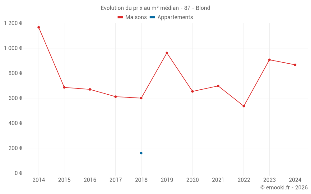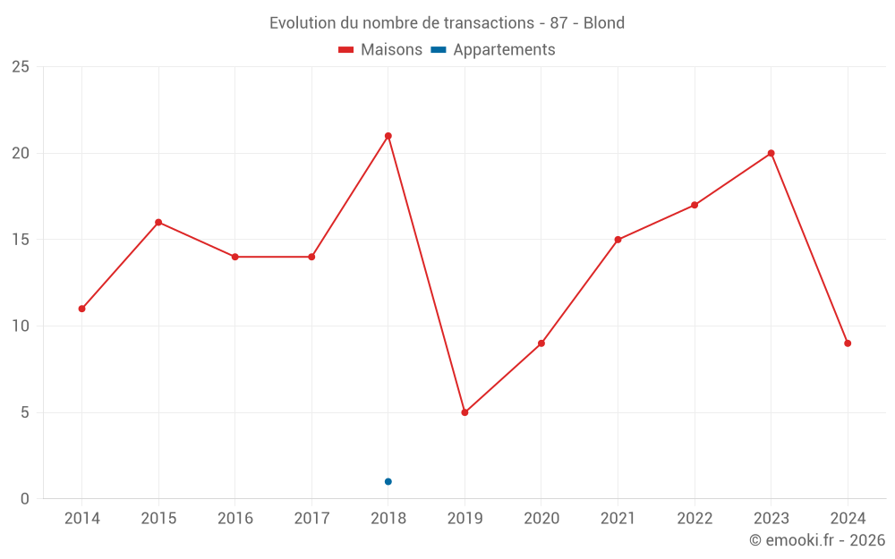 Le prix médian sur les 21 transactions de maisons des 24 derniers mois dans la commune de Blond était de 867 € par mètre carré pour une valeur foncière médiane de 85 000 €. Sur cette période 60% des transactions se sont situées entre 538 et 2 308 € par mètre carré (du 2ème au 8ème déciles).