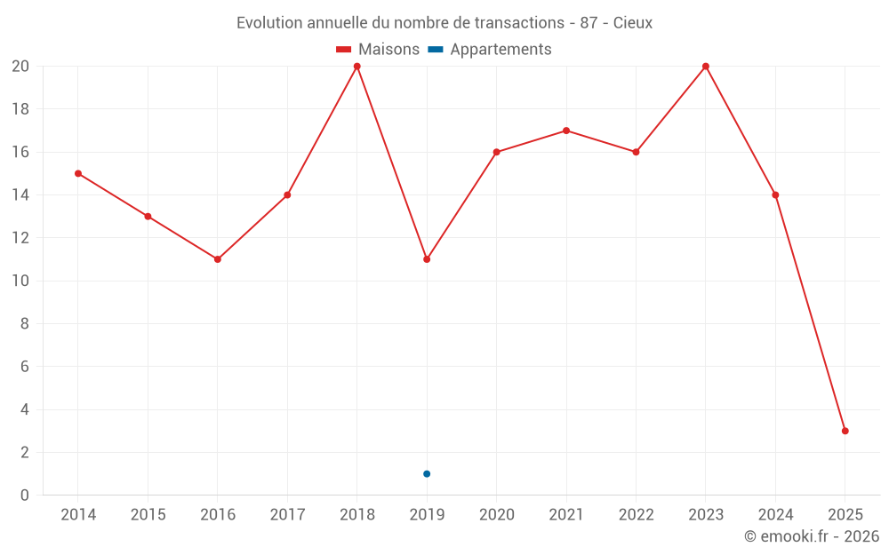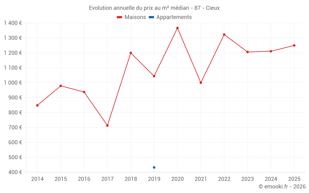 Le prix médian sur les 23 transactions de maisons des 24 derniers mois dans la commune de Cieux était de 1 250 € par mètre carré pour une valeur foncière médiane de 91 324 €. Sur cette période 60% des transactions se sont situées entre 603 et 1 773 € par mètre carré (du 2ème au 8ème déciles).