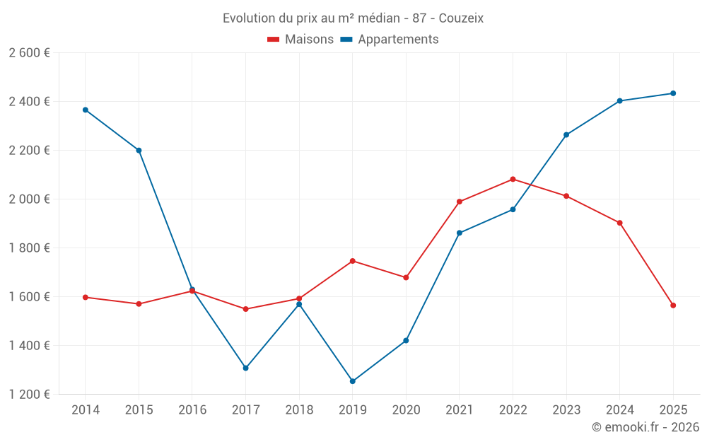 Le prix médian sur les 38 transactions d'appartements des 24 derniers mois dans la commune de Couzeix était de 2 274 € par mètre carré pour une valeur foncière médiane de 115 250 €. Sur cette période 60% des transactions se sont situées entre 1 785 et 2 450 € par mètre carré (du 2ème au 8ème déciles).