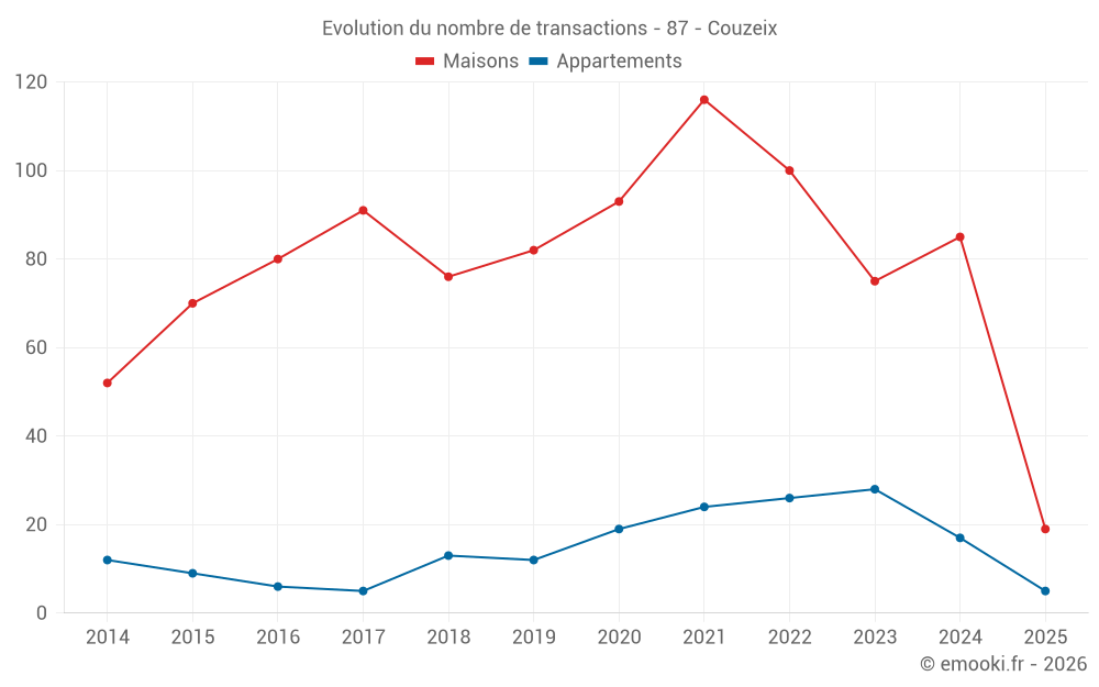 Le prix médian sur les 19 transactions de maisons des 6 derniers mois dans la commune de Couzeix était de 1 565 € par mètre carré pour une valeur foncière médiane de 172 000 €. Sur cette période 60% des transactions se sont situées entre 1 216 et 2 241 € par mètre carré (du 2ème au 8ème déciles).