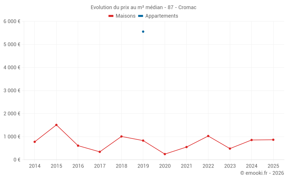 Le prix médian sur les 17 transactions de maisons des 24 derniers mois dans la commune de Cromac était de 867 € par mètre carré pour une valeur foncière médiane de 75 420 €. Sur cette période 60% des transactions se sont situées entre 598 et 1 296 € par mètre carré (du 2ème au 8ème déciles).