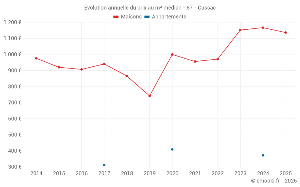 Le prix médian sur les 16 transactions de maisons des 12 derniers mois dans la commune de Cussac était de 1 068 € par mètre carré pour une valeur foncière médiane de 75 975 €. Sur cette période 60% des transactions se sont situées entre 687 et 1 918 € par mètre carré (du 2ème au 8ème déciles).