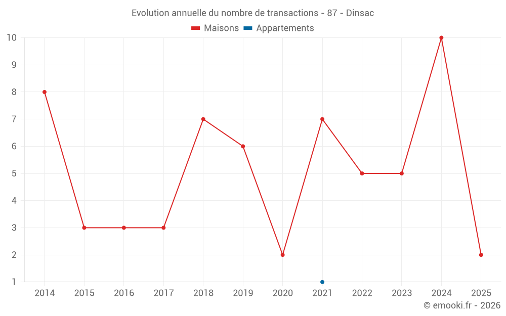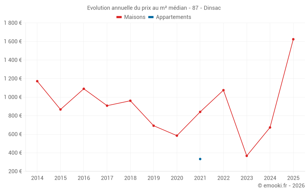 Le prix médian sur les 14 transactions de maisons des 24 derniers mois dans la commune de Dinsac était de 673 € par mètre carré pour une valeur foncière médiane de 68 614 €. Sur cette période 60% des transactions se sont situées entre 349 et 1 223 € par mètre carré (du 2ème au 8ème déciles).