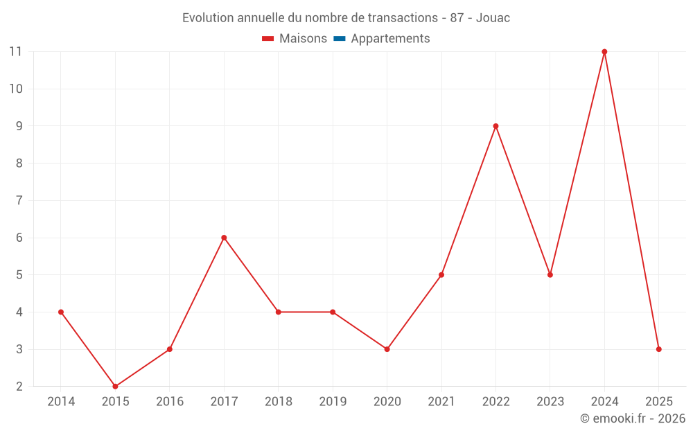 Le prix médian sur les 17 transactions de maisons des 24 derniers mois dans la commune de Jouac était de 938 € par mètre carré pour une valeur foncière médiane de 90 000 €. Sur cette période 60% des transactions se sont situées entre 518 et 1 073 € par mètre carré (du 2ème au 8ème déciles).