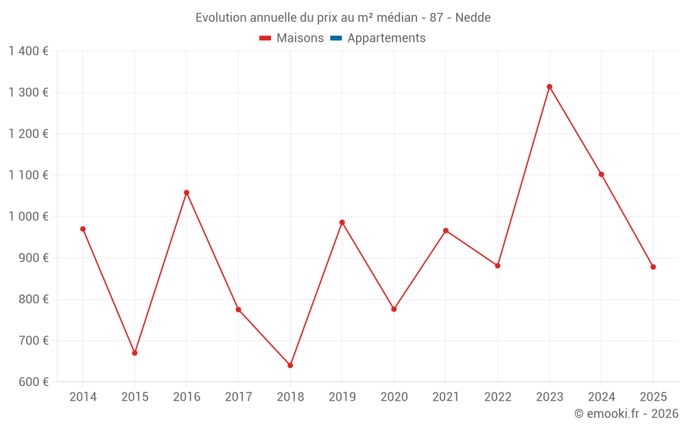 Le prix médian sur les 24 transactions de maisons des 24 derniers mois dans la commune de Nedde était de 954 € par mètre carré pour une valeur foncière médiane de 75 000 €. Sur cette période 60% des transactions se sont situées entre 649 et 1 640 € par mètre carré (du 2ème au 8ème déciles).