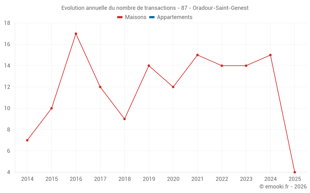 Le prix médian sur les 26 transactions de maisons des 24 derniers mois dans la commune d'Oradour-Saint-Genest était de 596 € par mètre carré pour une valeur foncière médiane de 58 225 €. Sur cette période 60% des transactions se sont situées entre 300 et 1 091 € par mètre carré (du 2ème au 8ème déciles).