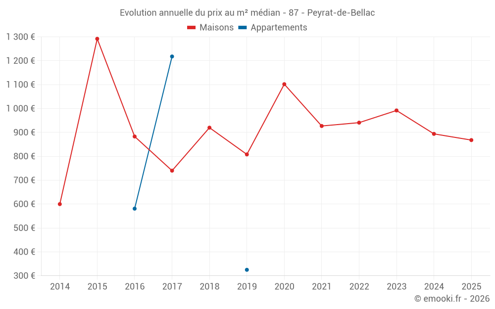 Le prix médian sur les 31 transactions de maisons des 24 derniers mois dans la commune de Peyrat-de-Bellac était de 980 € par mètre carré pour une valeur foncière médiane de 75 455 €. Sur cette période 60% des transactions se sont situées entre 397 et 1 320 € par mètre carré (du 2ème au 8ème déciles).