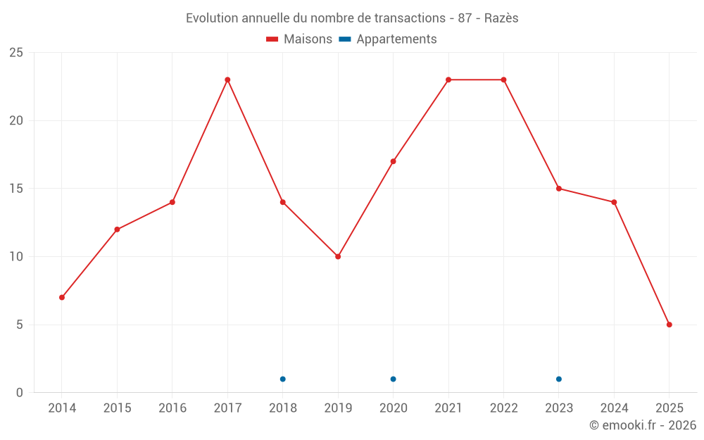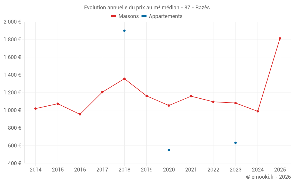 Le prix médian sur les 28 transactions de maisons des 24 derniers mois dans la commune de Razès était de 1 066 € par mètre carré pour une valeur foncière médiane de 85 000 €. Sur cette période 60% des transactions se sont situées entre 455 et 1 608 € par mètre carré (du 2ème au 8ème déciles).