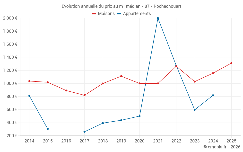 Le prix médian sur les 27 transactions de maisons des 6 derniers mois dans la commune de Rochechouart était de 1 311 € par mètre carré pour une valeur foncière médiane de 99 650 €. Sur cette période 60% des transactions se sont situées entre 712 et 1 801 € par mètre carré (du 2ème au 8ème déciles).