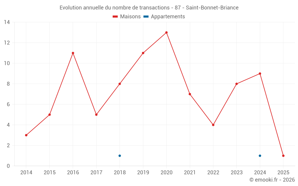 Le prix médian sur les 14 transactions de maisons des 24 derniers mois dans la commune de Saint-Bonnet-Briance était de 1 206 € par mètre carré pour une valeur foncière médiane de 137 750 €. Sur cette période 60% des transactions se sont situées entre 727 et 1 677 € par mètre carré (du 2ème au 8ème déciles).