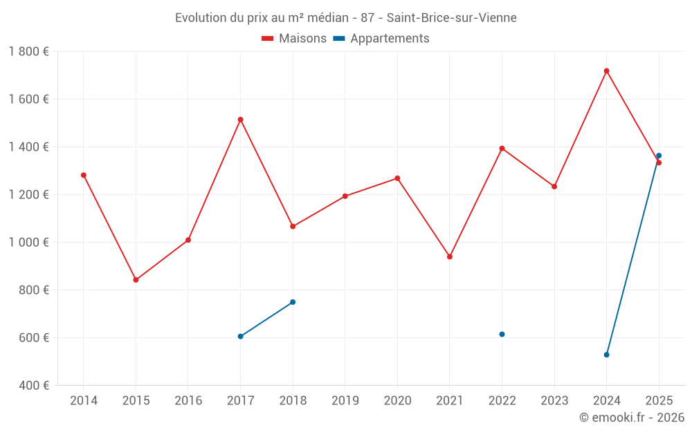 Le prix médian sur les 16 transactions de maisons des 12 derniers mois dans la commune de Saint-Brice-sur-Vienne était de 1 564 € par mètre carré pour une valeur foncière médiane de 131 250 €. Sur cette période 60% des transactions se sont situées entre 1 334 et 2 092 € par mètre carré (du 2ème au 8ème déciles).