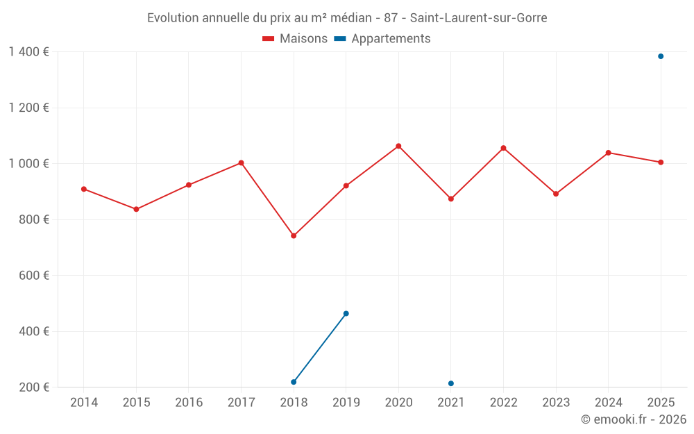 Le prix médian sur les 20 transactions de maisons des 12 derniers mois dans la commune de Saint-Laurent-sur-Gorre était de 1 060 € par mètre carré pour une valeur foncière médiane de 109 250 €. Sur cette période 60% des transactions se sont situées entre 848 et 1 546 € par mètre carré (du 2ème au 8ème déciles).