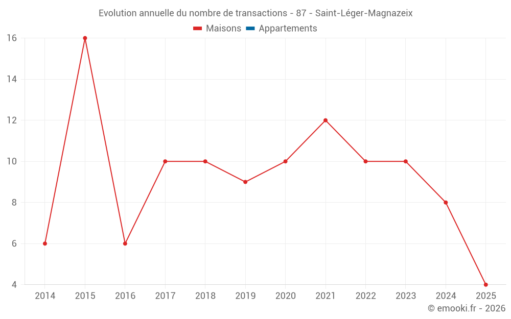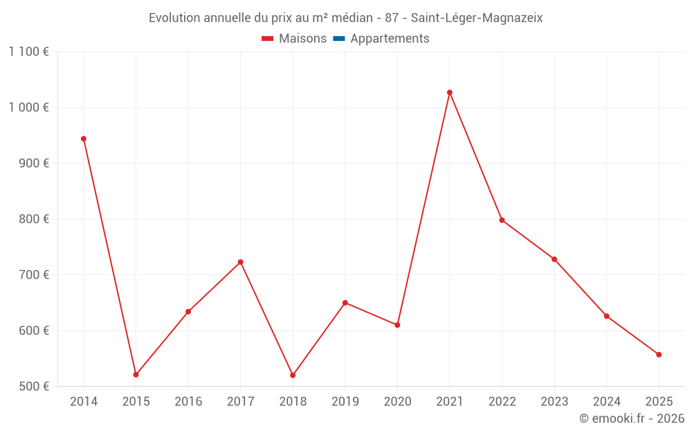 Le prix médian sur les 19 transactions de maisons des 24 derniers mois dans la commune de Saint-Léger-Magnazeix était de 650 € par mètre carré pour une valeur foncière médiane de 64 000 €. Sur cette période 60% des transactions se sont situées entre 356 et 1 271 € par mètre carré (du 2ème au 8ème déciles).
