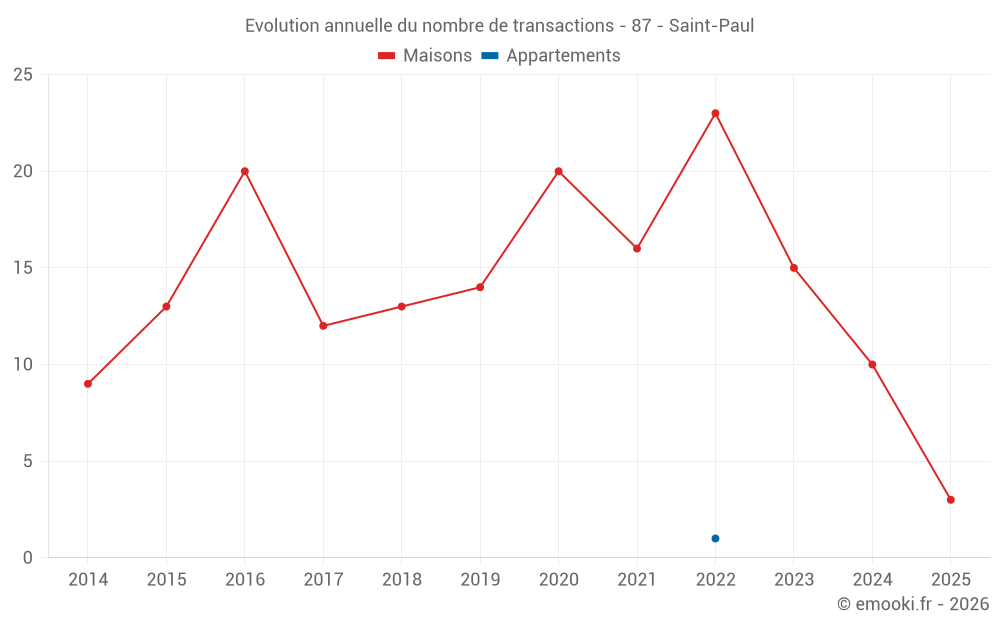 Le prix médian sur les 19 transactions de maisons des 24 derniers mois dans la commune de Saint-Paul était de 1 530 € par mètre carré pour une valeur foncière médiane de 125 000 €. Sur cette période 60% des transactions se sont situées entre 811 et 1 840 € par mètre carré (du 2ème au 8ème déciles).