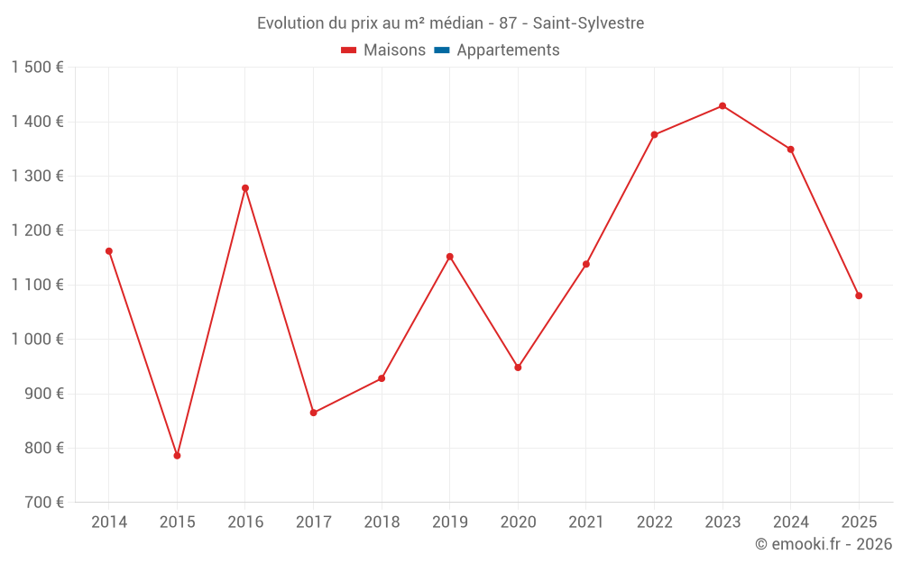 Le prix médian sur les 20 transactions de maisons des 24 derniers mois dans la commune de Saint-Sylvestre était de 1 201 € par mètre carré pour une valeur foncière médiane de 95 000 €. Sur cette période 60% des transactions se sont situées entre 528 et 1 705 € par mètre carré (du 2ème au 8ème déciles).