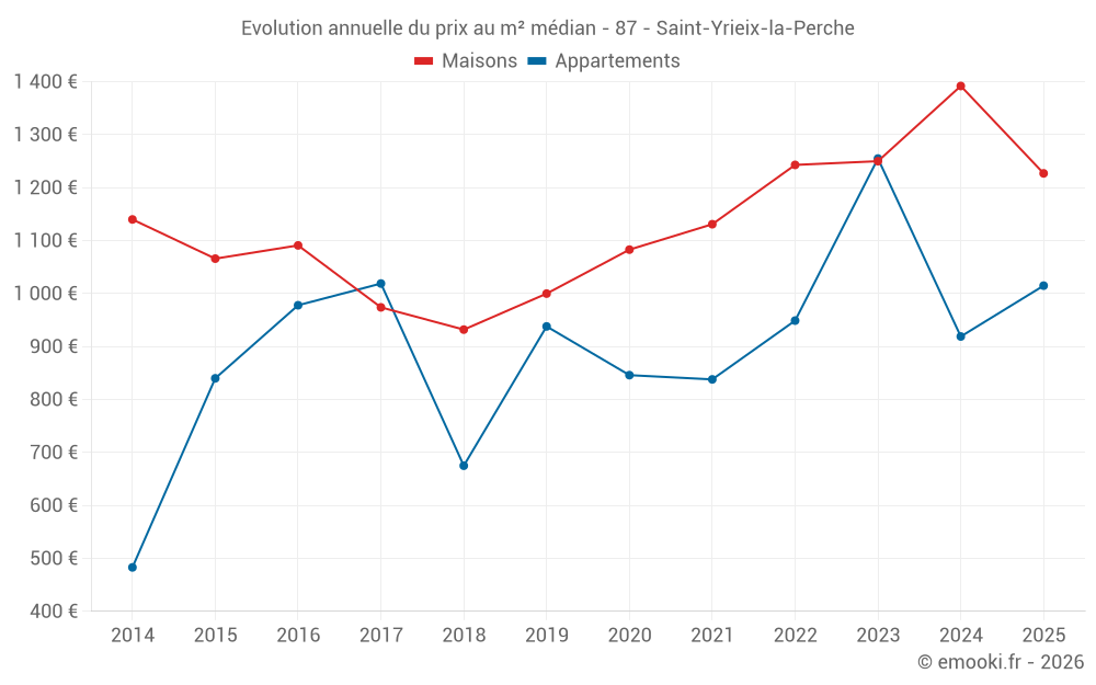 Le prix médian sur les 32 transactions d'appartements des 24 derniers mois dans la commune de Saint-Yrieix-la-Perche était de 976 € par mètre carré pour une valeur foncière médiane de 82 625 €. Sur cette période 60% des transactions se sont situées entre 598 et 1 435 € par mètre carré (du 2ème au 8ème déciles).