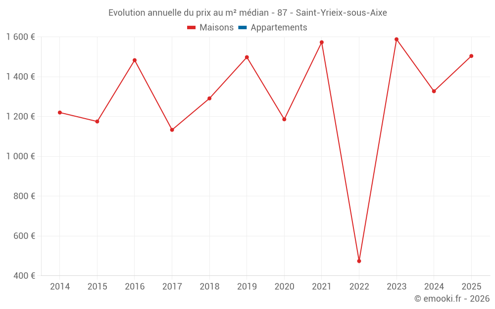 Le prix médian sur les 19 transactions de maisons des 24 derniers mois dans la commune de Saint-Yrieix-sous-Aixe était de 1 408 € par mètre carré pour une valeur foncière médiane de 152 000 €. Sur cette période 60% des transactions se sont situées entre 864 et 1 962 € par mètre carré (du 2ème au 8ème déciles).