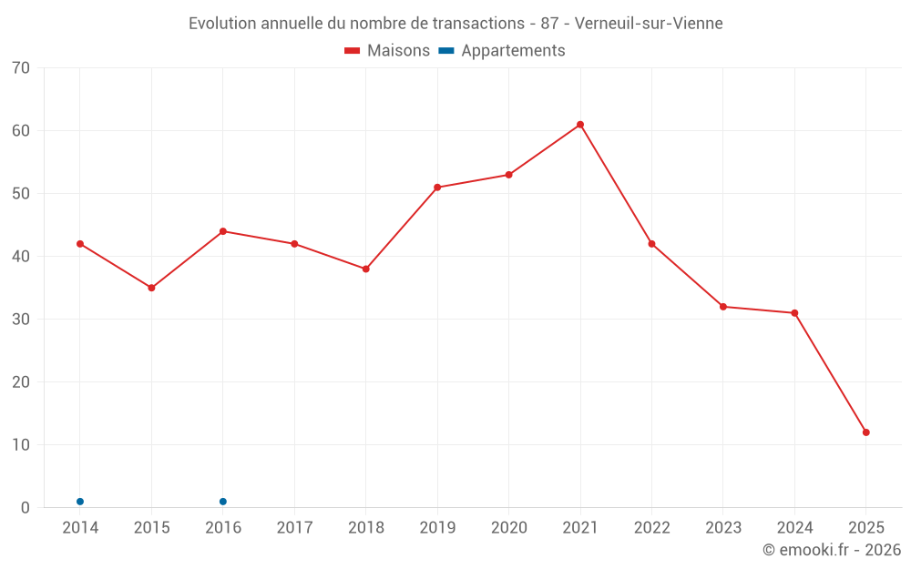 Le prix médian sur les 27 transactions de maisons des 12 derniers mois dans la commune de Verneuil-sur-Vienne était de 2 000 € par mètre carré pour une valeur foncière médiane de 209 000 €. Sur cette période 60% des transactions se sont situées entre 1 365 et 2 319 € par mètre carré (du 2ème au 8ème déciles).