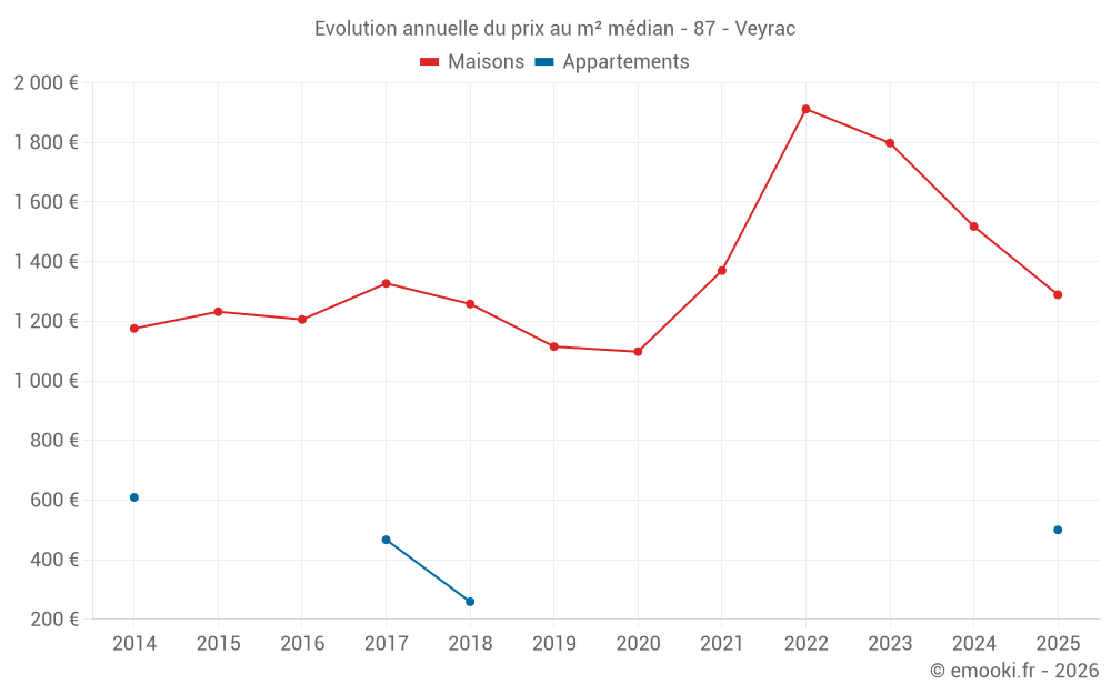 Le prix médian sur les 32 transactions de maisons des 24 derniers mois dans la commune de Veyrac était de 1 398 € par mètre carré pour une valeur foncière médiane de 143 775 €. Sur cette période 60% des transactions se sont situées entre 962 et 1 922 € par mètre carré (du 2ème au 8ème déciles).