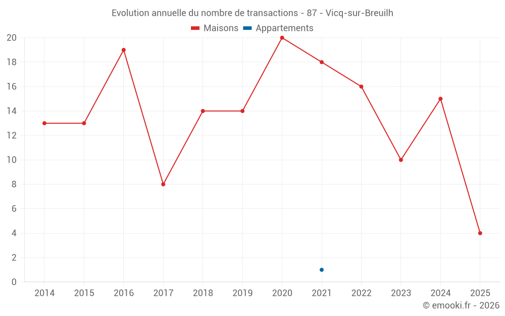 Le prix médian sur les 23 transactions de maisons des 24 derniers mois dans la commune de Vicq-sur-Breuilh était de 1 490 € par mètre carré pour une valeur foncière médiane de 150 000 €. Sur cette période 60% des transactions se sont situées entre 1 088 et 1 923 € par mètre carré (du 2ème au 8ème déciles).